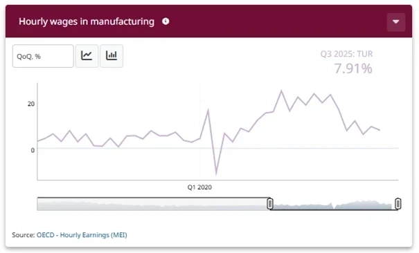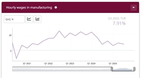 2025 Q3 Verisi: İmalat sanayinde çeyreklik bazda saatlik ücret artışı %7,91 olarak gerçekleşti.