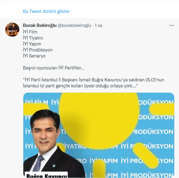İYİ Parti İstanbul İl Başkanı İsmail Buğra Kavuncu’ya saldıran (S.O)’nun İstanbul iyi parti gençlik kolları üyesi olduğu ortaya çıktı...” dedi.